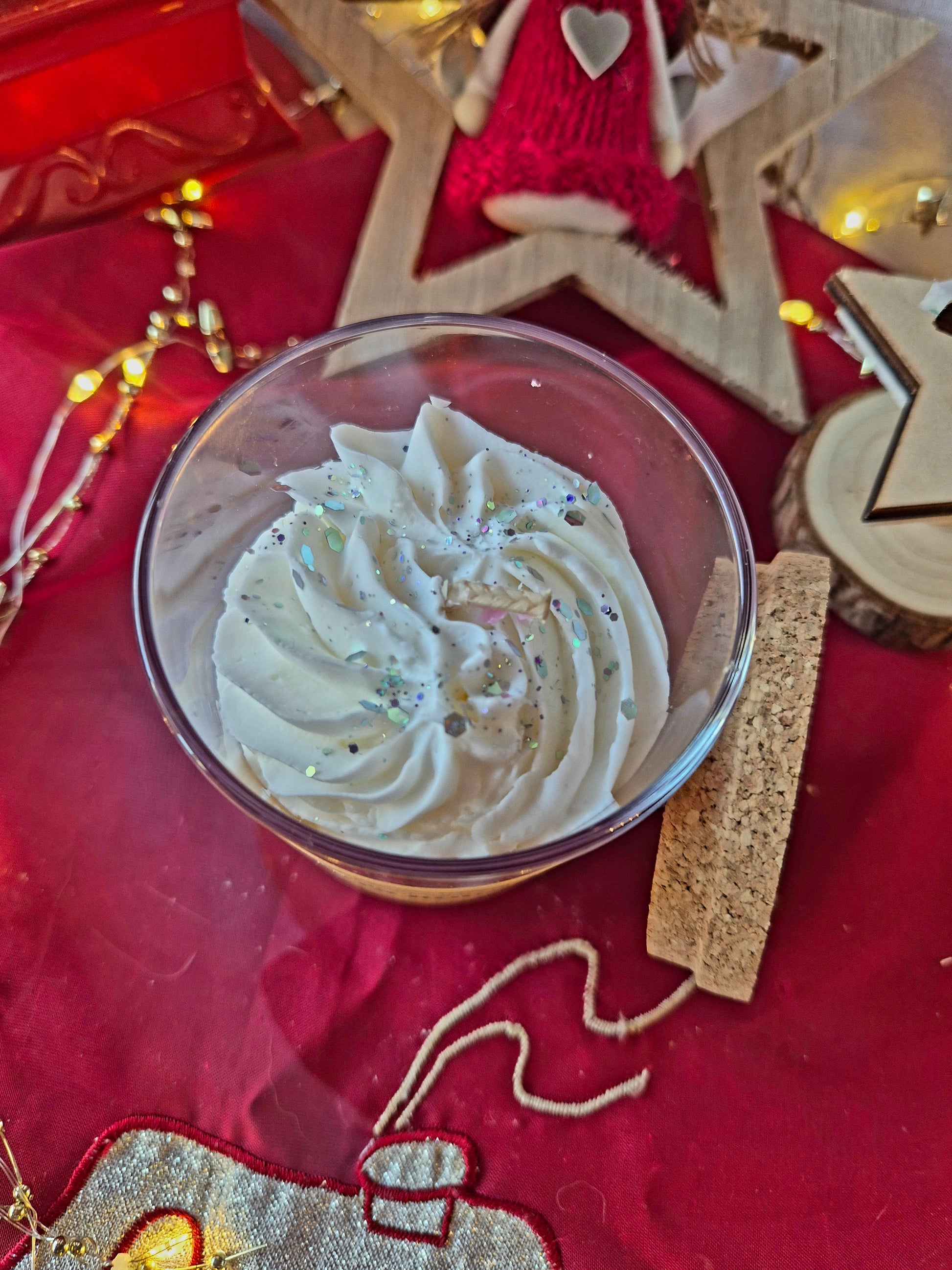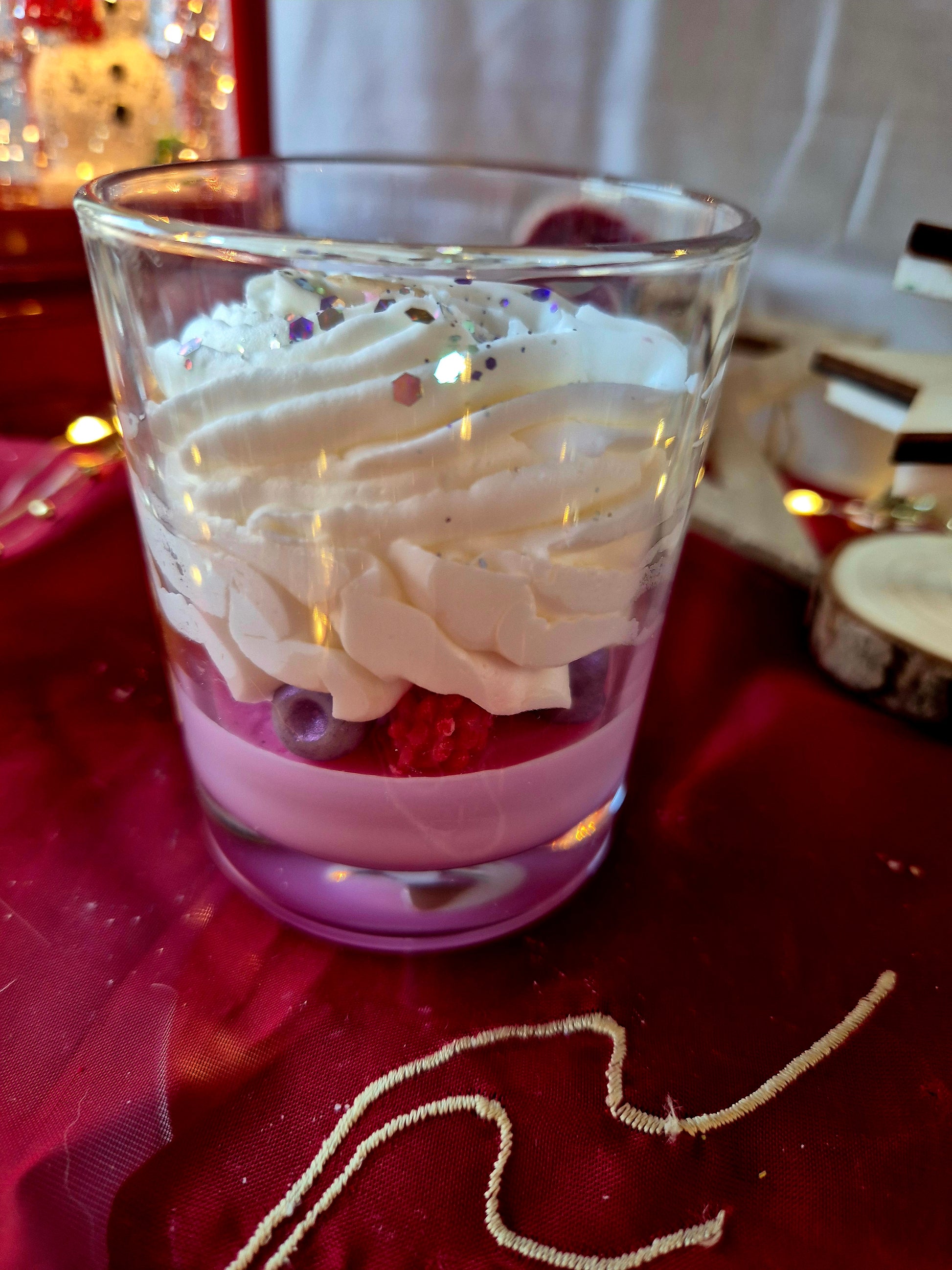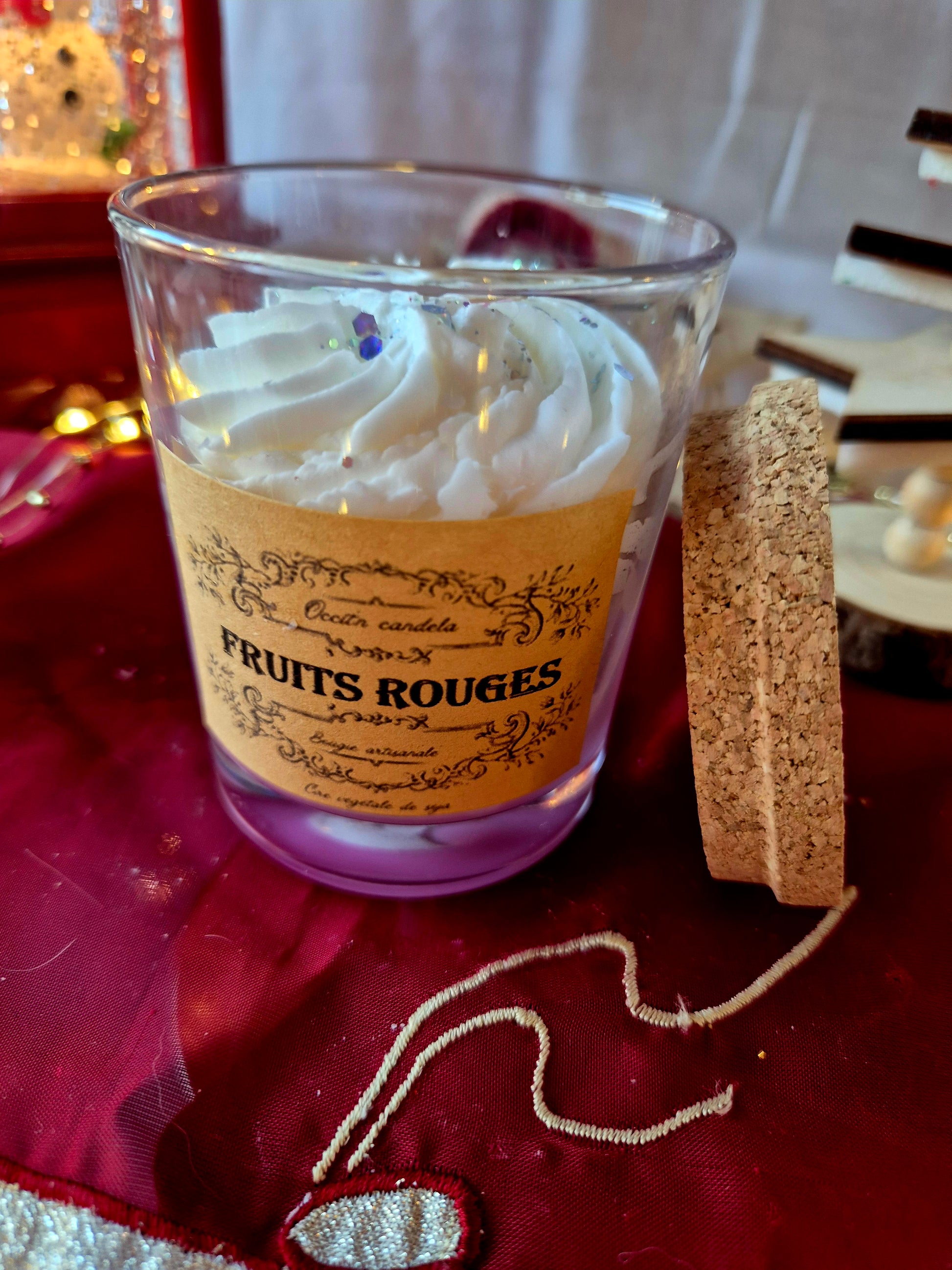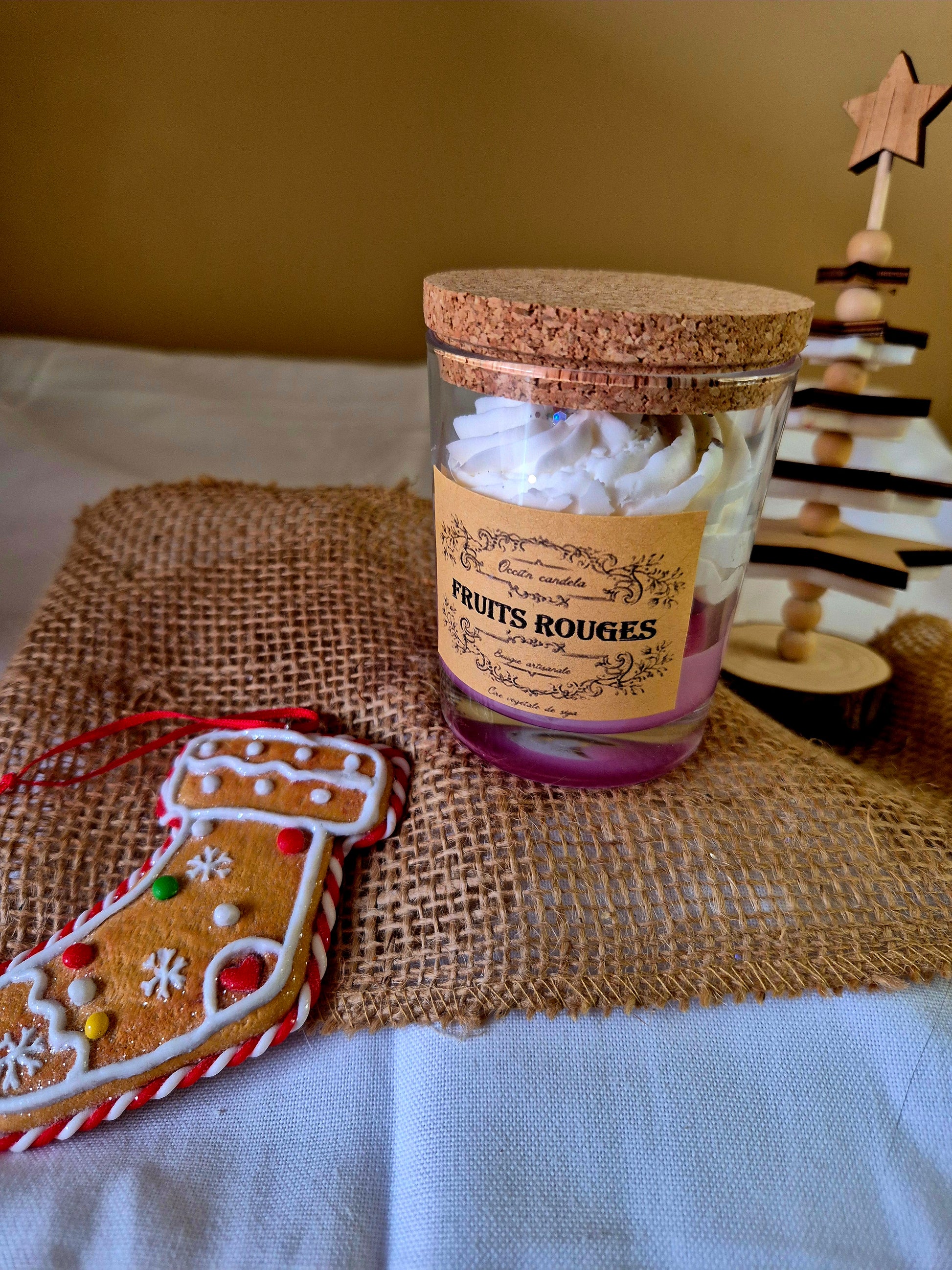 Sous sa chantilly blanche, la bougie fruits rouges dévoile un parfum sucré et légèrement acidulé, comme une confiture maison dégustée en plein hivers.