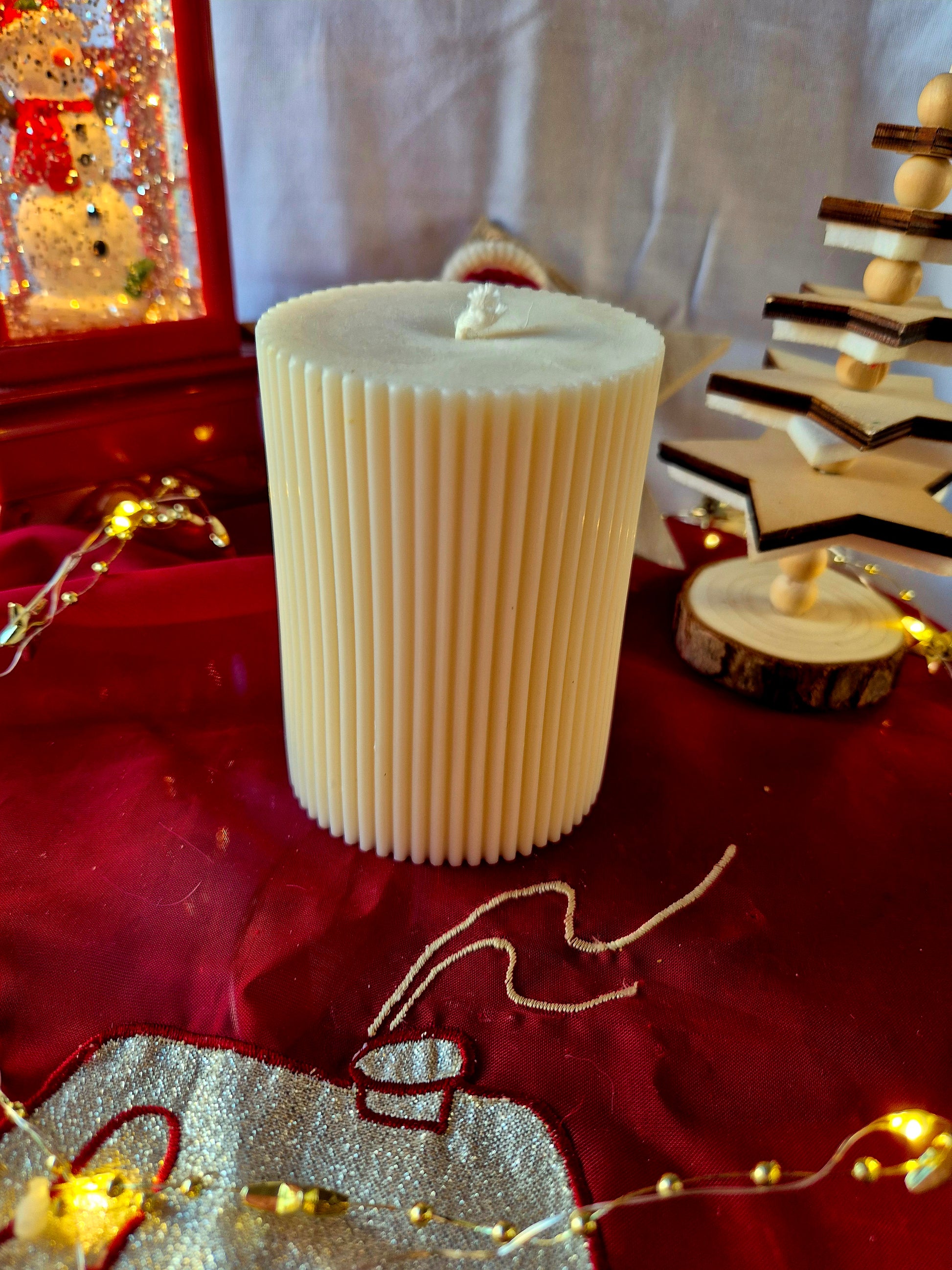 La bougie Freya se distingue par ses striures fines et régulières qui parcourent toute sa hauteur, créant un subtil jeu de texture et de lumière.