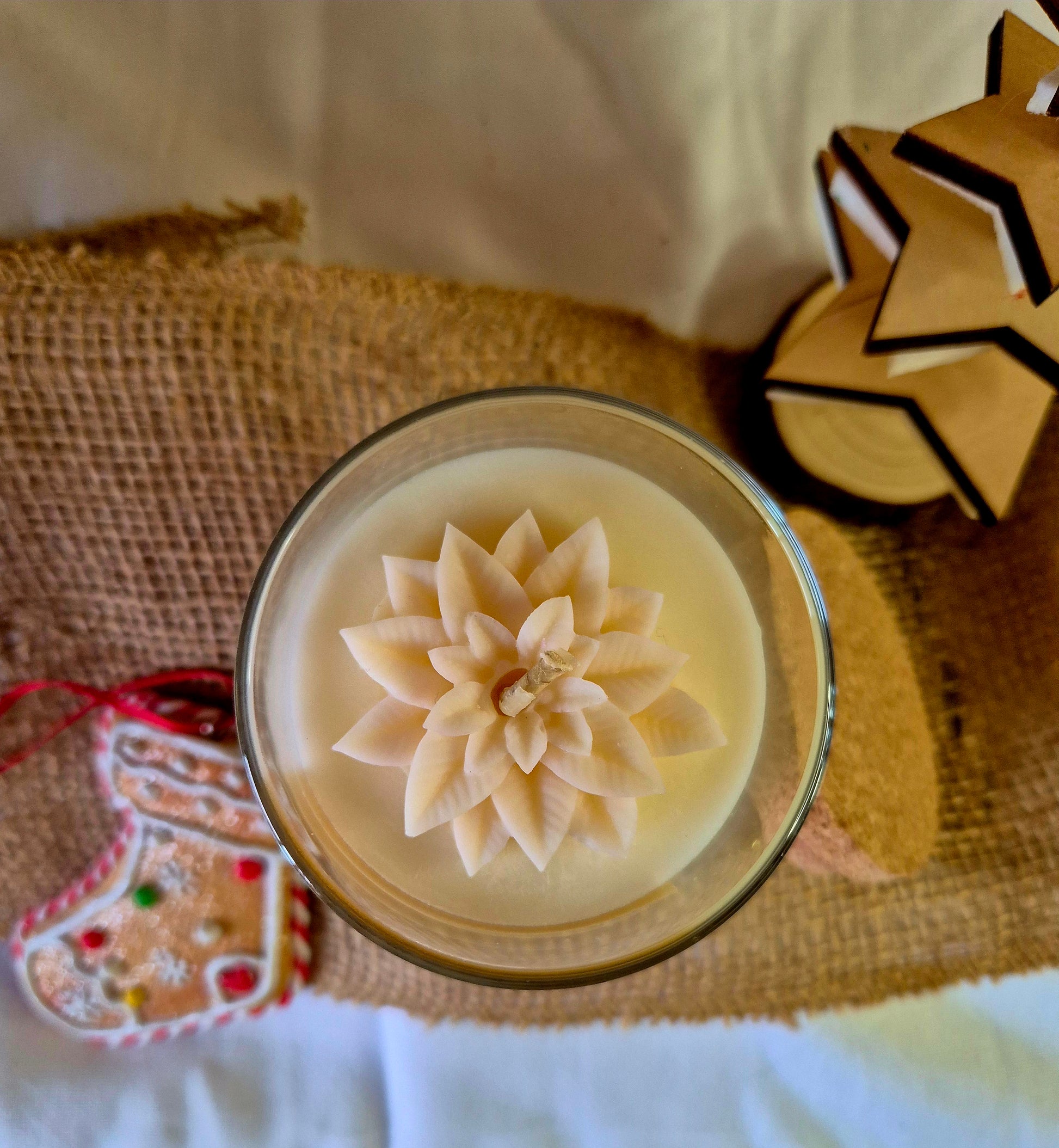 Une bougie blanche pure et lumineuse, décorée délicatement d'une fleur de noel posée sur sa surface.