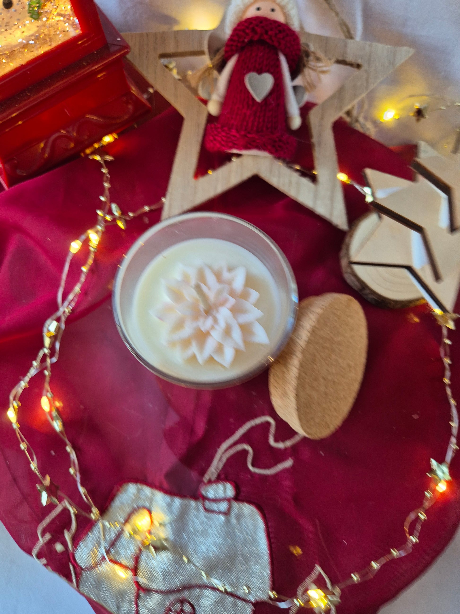 Une bougie blanche chaleureuse, décorée d'une fleur de Noël posée délicatement sur sa surface.